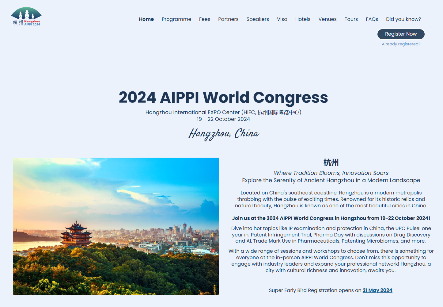 2024年AIPPI世界知识产权大会将于10月19日—22日在杭州举办。从AIPPI中国分会获悉,在距离AIPPI杭州大会开幕还有150天之际,注册报名通道开启,这也意味着,AIPPI杭州世界知识产权大会的筹办工作进入了新阶段,“杭州大会”的脚步更近了。
