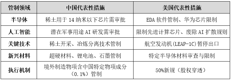中国管制措施更多集中在上游上端,具有“资源导向”特点,通过对关键矿产、基础材料和成熟技术的限制,影响全球制造业中下游;而美国管制则聚焦于技术高端,具有“创新导向”,针对前沿科技进行封锁。