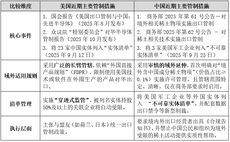 此外,两国的管制理念在交锋中也在相互影响。美国在2025年9月推出的“50%新规”,将实体清单和军事最终用户清单的适用范围扩大到被列名实体持股50%及以上的关联企业,体现了其规则精细化与边界扩张趋势。[注5]而中国在2025年10月的稀土管制中,对“境外含中国成分稀土物项”实施管制,则显示出中国正在从被动应对转向主动塑造国际管制规则。这种互动使得中美出口管制体系在竞争中有趋同,但在战略目标上仍保持根本性分歧。[注6]