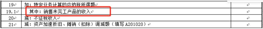 在第19行“特定业务计算的应纳税所得额”下新增第19.1行“销售未完工产品的收入”,填报房地产企业按照规定计算预计毛利额的销售未完工开发产品取得的预售收入的累计金额。