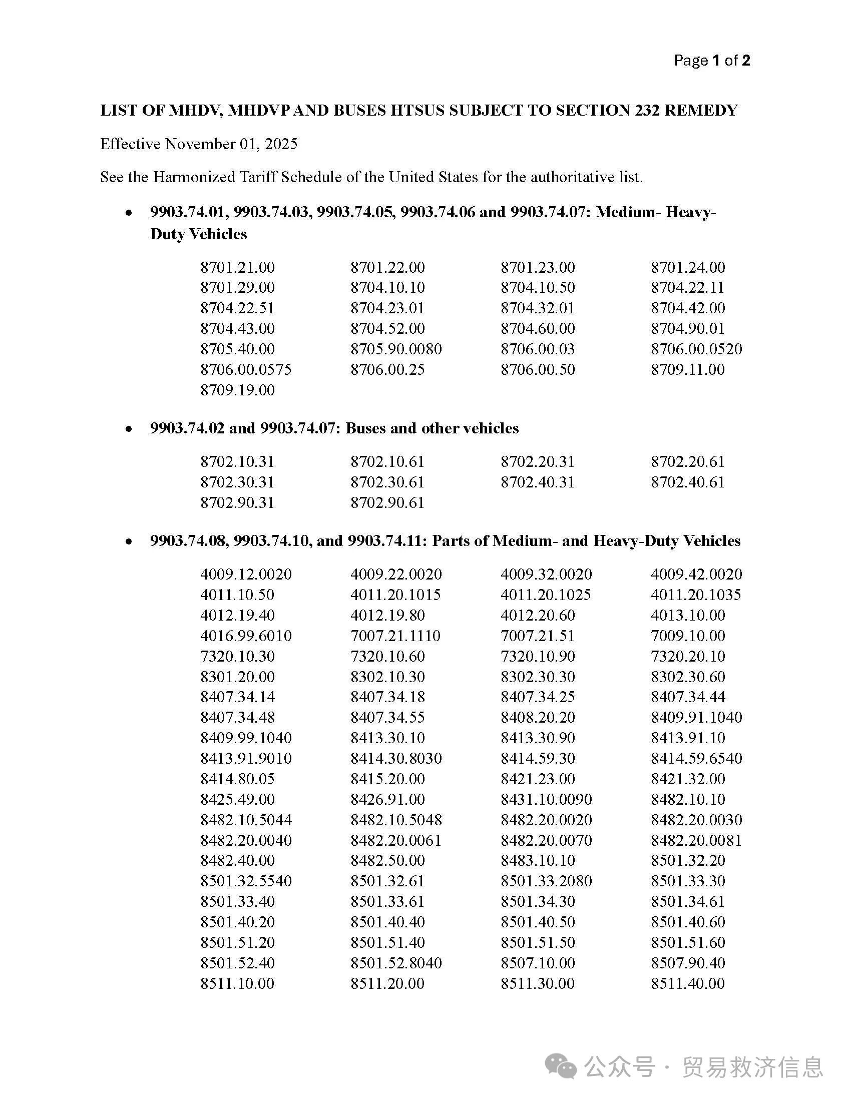 2025年10月17日,美国总统根据《1962年贸易扩展法》第232条(经修订)(19 U.S.C. 1862),发布了第10984号总统公告《调整中型和重型卡车、中型和重型卡车零部件及公交车的进口》,对中型和重型车辆(MHDVs)、中型和重型车辆零部件(MHDVPs)及公交车等进口商品征收10%至25%的从价关税,自2025年11月1日生效。详见《调整中型和重型车辆、中型和重型车辆零部件及公交车的进口》(2025年10月22日,90 FR 48451)。