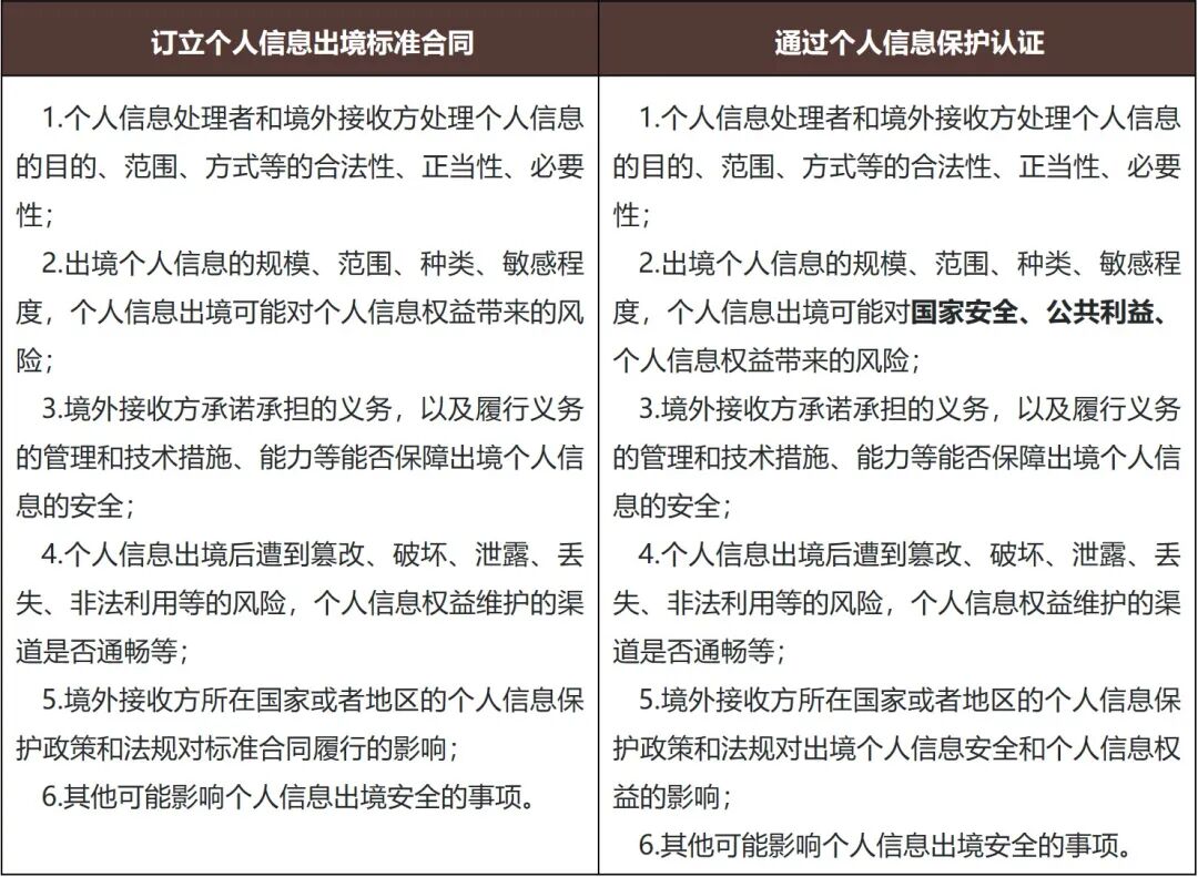 结合法律规定和执法实践,数据跨境管理无疑是监管重点之一,也呈现出精细化、科学化管理的趋势。企业在数据出境合规中,宜综合、准确理解有关法律法规要求,选择合适的数据出境方式,优化企业合规成本,同时避免数据出境不合规带来的法律风险。根据《个人信息保护法》《网络数据安全管理条例》《规范和促进数据跨境流动规定》等要求,在豁免情形和依法应当申报数据出境安全评估以外(参见前述),个人信息处理者开展数据出境活动的,满足“订立个人信息出境标准合同”或“通过个人信息保护认证”的条件之一即可。根据《认证办法》和《个人信息出境标准合同办法》的规定,两种方式的要求基本一致(具体见下表)。