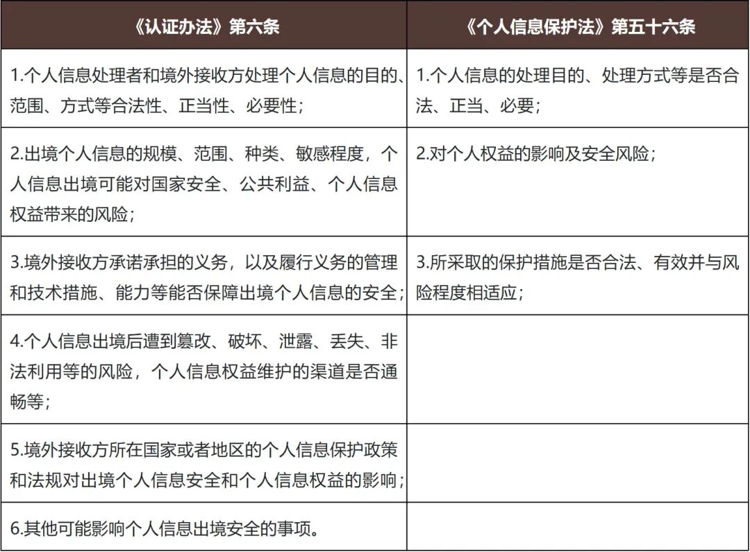 个人信息保护影响评估(PIA)是《个人信息保护法》规定的一项法定的、前置性义务,要求个人信息处理者在开展高风险个人信息处理活动之前(如向境外提供个人信息、处理敏感个人信息等),评估个人信息处理目的和处理方式、对个人权益的影响及安全风险、采取的保护措施的有效性等,以更进一步防范高风险个人信息处理活动可能带来的影响。并且,个人信息保护影响评估报告和处理情况记录应当至少保存三年。《认证办法》重申了这一要求,并针对跨境场景明确了PIA的重点评估内容(具体见下表)。