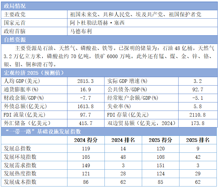 政治环境方面,埃及政局总体稳定,政府持续推进经济改革与大型国家项目,政策连续性较强,但需密切关注中东地区地缘冲突、苏伊士运河安全等外部风险对其稳定性的潜在影响。经济环境方面,埃及面临高通胀、外汇压力及公共债务挑战,但苏伊士运河收入、侨汇、旅游业及非油气出口仍支撑经济增长,预计2025年GDP增速为3.2%。营商环境方面,埃及政府通过投资改革立法、设立“黄金许可证”机制简化外资审批,并在苏伊士经济区等特区推行税收减免和用地优惠,持续推动外资准入便利化和民营企业参与。