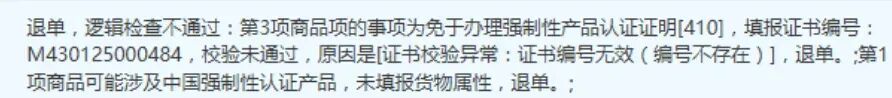 第3项商品项的事项为免于办理强制性产品认证证明[410],填报证书编号:M430125000484,校验未通过,原因是[证书校验异常:证书编号无效(编号不存在)],退单。第1项商品可能涉及中国强制性认证产品,未填报货物属性,退单。