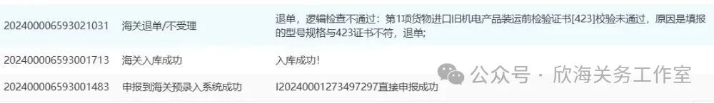 退单原因-逻辑检查不通过:第1项货物进口旧机电产品装运前检验证书[423]校验未通过,原因是填报的型号规格与423证书不符,退单。