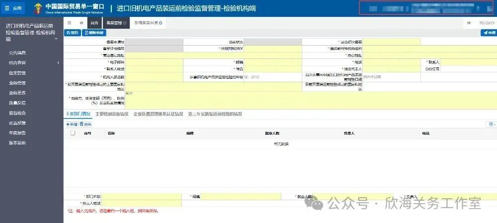 解决方案:此类情况涉及旧机电类产品进口涉及装运前检验检疫的,需要在国外发货前先做好装运前检验检疫证书,检测合格后方可进口,在国外做好装运前检验检疫证书后,在进口前企业需要至单一窗口里进口旧机电产品装运前检验监督管理内将装运前检验检疫证书及相关信息录入,在申报时达到联网信息一致。录入界面请见下图: