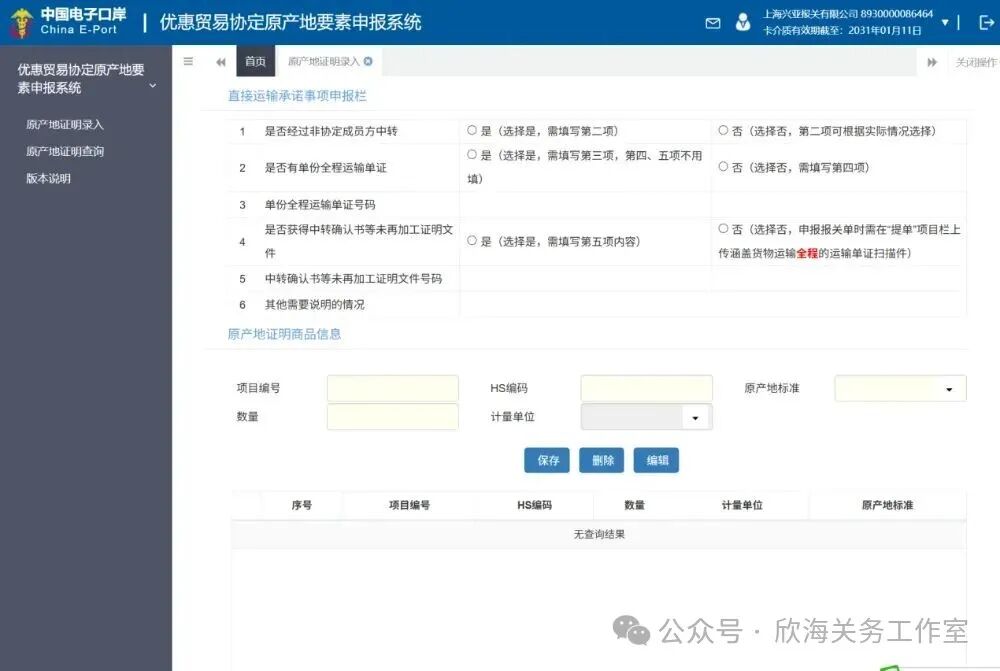 内录入原产地证要素信息,注意录入要素信息需要原产地证显示要素的信息一致,录入完成后方可进行报关申报,如果未进行录入或录入信息与报关单录入信息不一致就会在申报时被退单。
