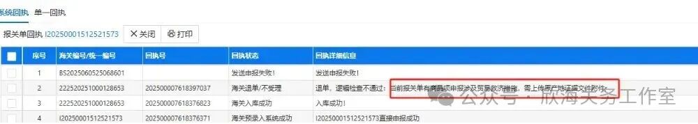 退单原因-逻辑检查不通过:当前报关单有商品项申报涉及贸易救济措施,需上传原产地证据文件附件。