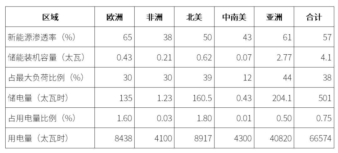 表 1 2050年全球各区域储能装机容量预测