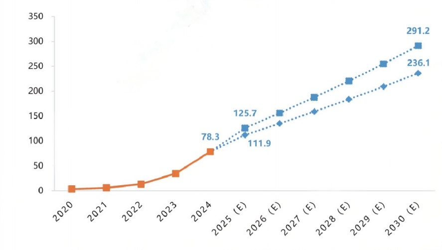 图 3 2020-2030年中国新型储能累计投运装机规模及预测(单位:GW)
