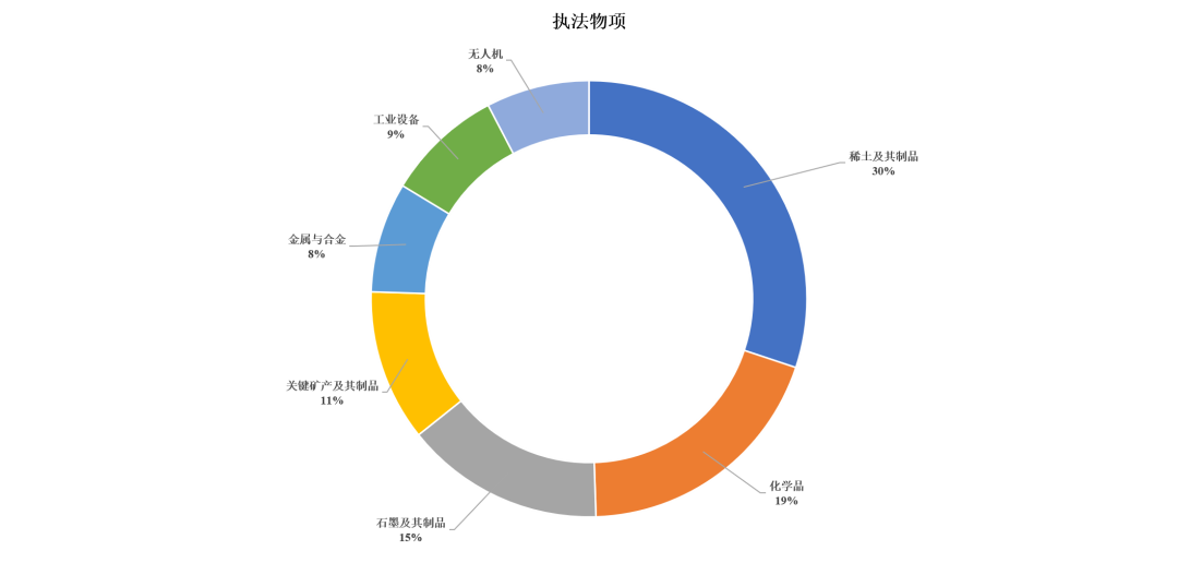 从物项维度来看,过去一年,以下7大类物项是我国出口管制执法的关注重点,即稀土及其制品、化学品、石墨及其制品、关键矿产及其制品、金属与合金、工业设备、无人机。