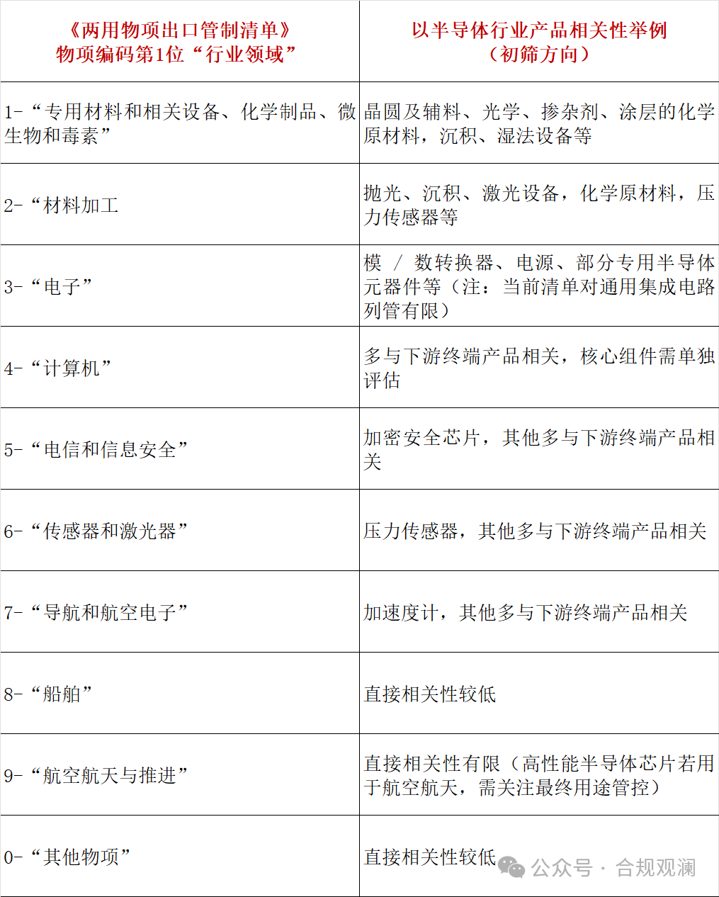 如前所述,由于目前《两用物项出口管制清单》对集成电路本身的着墨不多,相关企业可以根据物项编码第1位的“行业领域”,结合自己在产业链中的角色及主营产品,快速定位到可能需要进一步深入研判的物项类别。